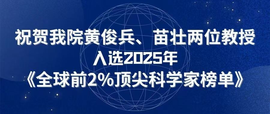 近日,由美国斯坦福大学和国际权威学术出版社爱思唯尔(Elsevier)发布的2025年全球前2%顶尖科学家榜单(World’s Top 2% Scientists)正式揭晓。我院黄俊兵教授、苗壮教授成功入选榜单,彰显了学院在高层次人才队伍建设与科研创新领域的显著成效。