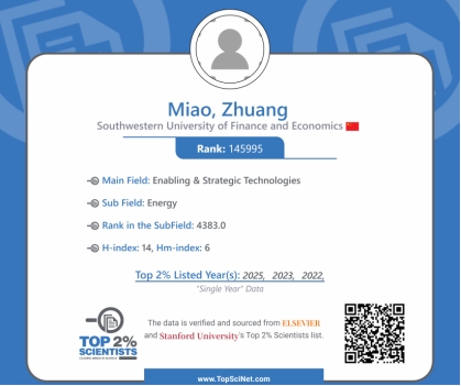 黄俊兵,教授,博士生导师,四川省学术与技术带头人,四川省第十八次社会科学优秀成果三等奖获得者。目前主要从事数字经济、绿色金融与节能减排等相关领域的研究,近年来以第一/通讯作者在SCI/SSCI/CSSCI期刊发表学术论文60余篇,论文他引2000余次。曾主持国家自科面上、教育部人文社科和服务于地方政府及企事业单位类项目10余项,连续多年入选Elsevier中国高被引学者,全球前2%顶尖科学家等。